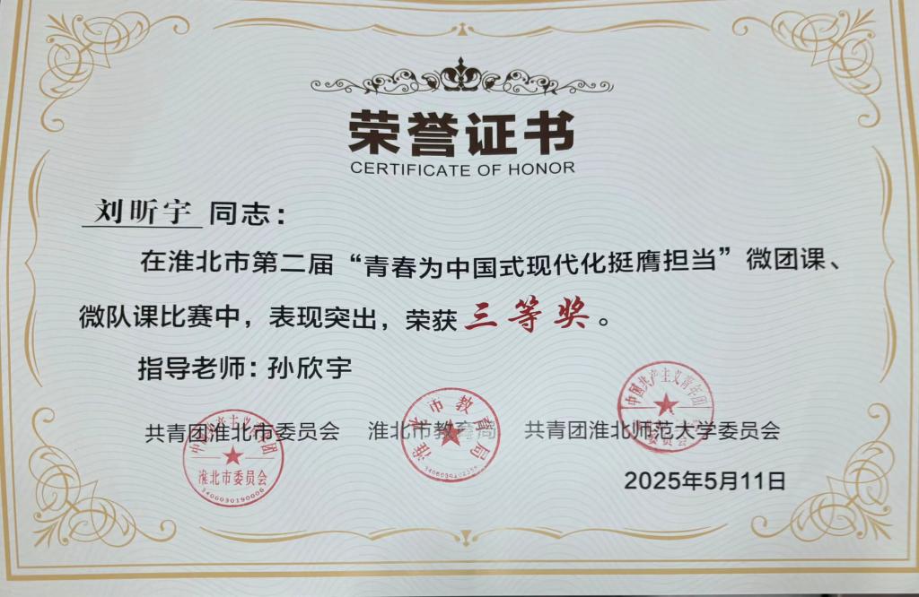 5月11日下午2时,由共青团淮北市委员会、共青团淮北师范大学委员会、淮北市教育局联合主办的淮北市第二届“青春为中国式现代化挺膺担当”微团课、微队课比赛圆满收官。这场聚焦时代主题、凝聚青春力量的赛事,为众多青年学子搭建了展示自我的舞台,来自太阳成集团122ccvip2024级刘昕宇同学在比赛中脱颖而出,荣获市级三等奖,展现出公司学子的卓越风采。