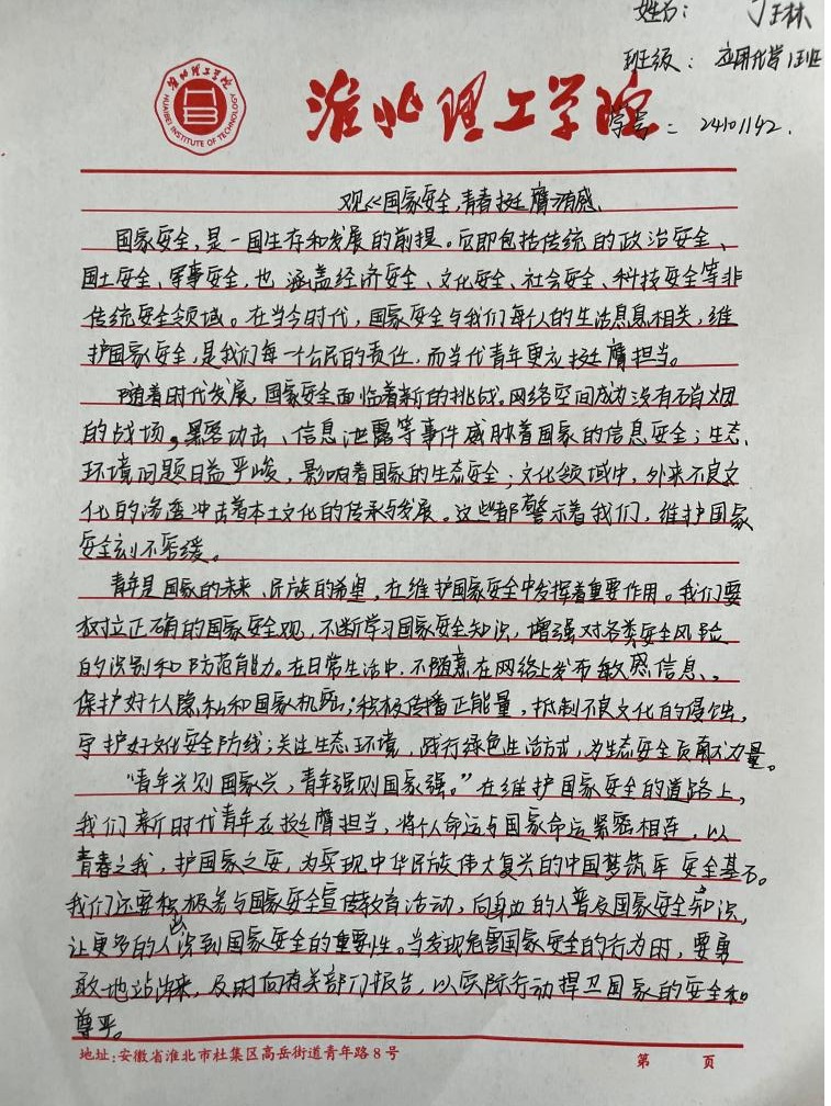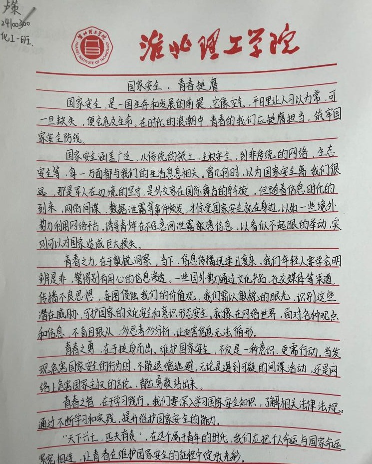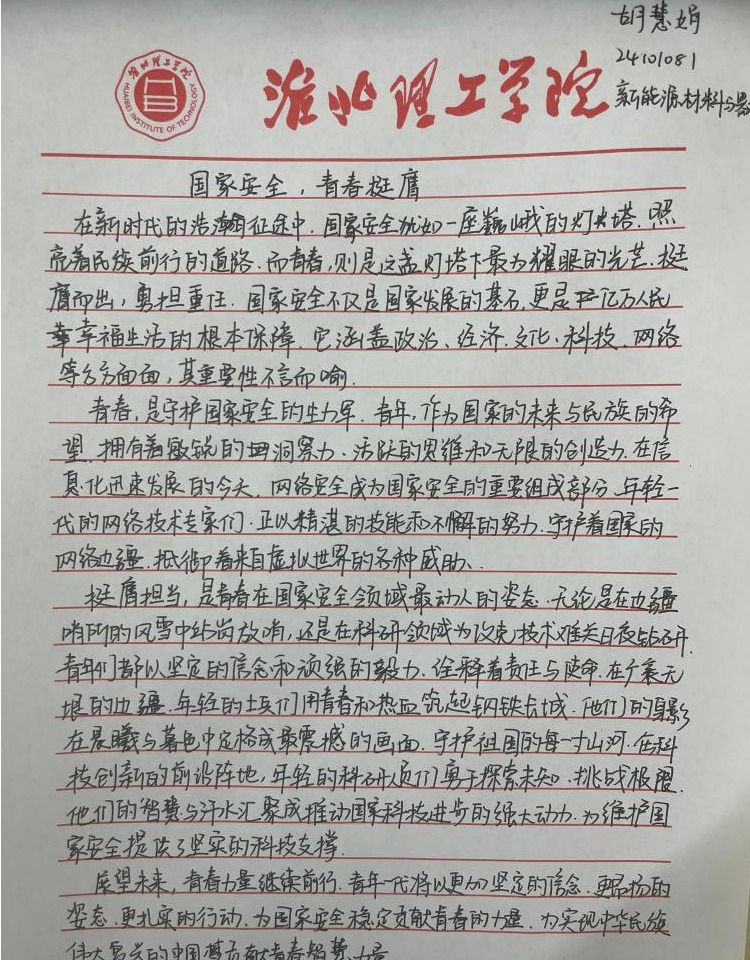 “国家安全,青春挺膺”感悟心得征集活动得到了同学们的积极响应,大家结合系列活动的参与体验,纷纷拿起笔,写下自己对国家安全的深刻感悟。有的同学在心得中写道:“国家安全是国家生存发展的基石,作为新时代青年,我们应立足专业,努力学习,为国家的文化安全和科技创新贡献力量。”还有的同学表示:“通过这次活动,我更加明白国家安全就在身边,我们要从点滴做起,自觉维护国家尊严和荣誉,以实际行动践行青春挺膺的誓言。”这些真挚的感悟,凝聚着同学们对国家安全的深刻理解和担当意识,也展现了太阳成集团122ccvip青年学子积极向上的精神风貌。