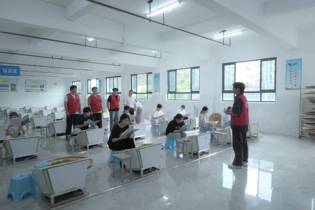 7月3日至4日,实践团先后走进岳西县文化馆、翡冷翠岳西翠兰茶文化展示中心,开启茶文化溯源之旅。在文化馆,队员们通过查阅史料文献、聆听馆员讲解,系统了解岳西翠兰从明清时期的起源、近代的发展到如今的产业规模,梳理出茶叶与当地民俗、节庆的紧密联系;在茶文化展示中心,团队深入考察不同年代的制茶工具、历代茶人手稿,观摩“岳西翠兰制作技艺”非遗传承人演示的传统工艺流程,详细记录杀青温度控制、揉捻力度等核心技艺要点。